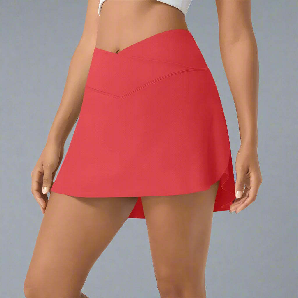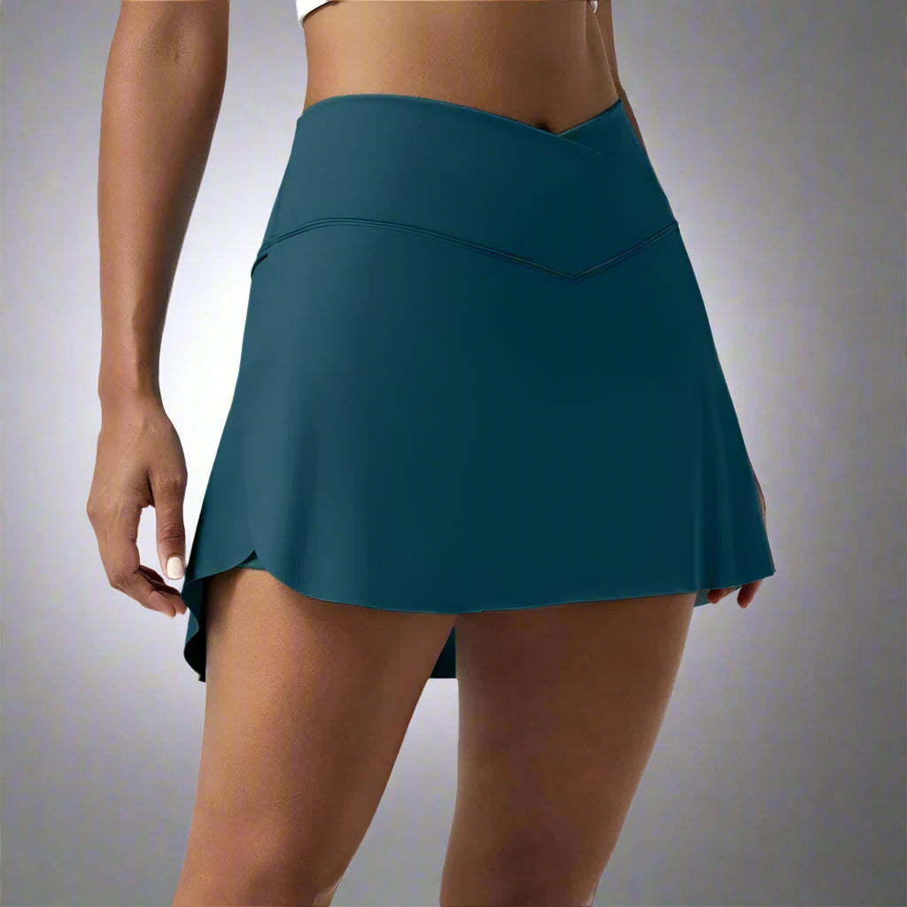 The combination of supportive inner shorts, a crossover waistband, and easy-access side pockets creates a go-to garment for active and casual use. The high-low hem and mini length deliver just the right amount of coverage with a stylish edge.