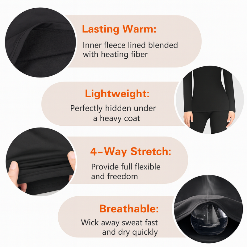 This thermal underwear for women combines style, warmth, and ease of movement. Its fleece lined fabric is designed to lock in heat, making it ideal for cold weather conditions. The lightweight yet soft design allows it to fit comfortably under jackets, sweaters, or jeans without adding bulk. Moisture-wicking fibers ensure you stay dry during active days outdoors or long hours indoors. The wide size range and multiple color options provide flexibility for different preferences.
