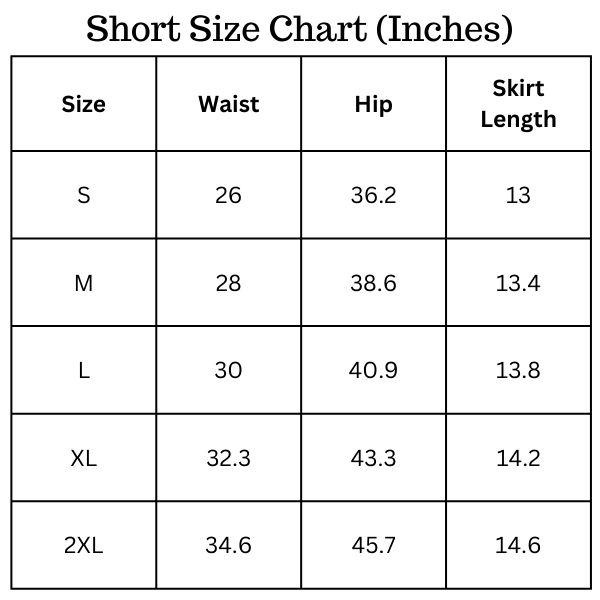Size Chart (inches):