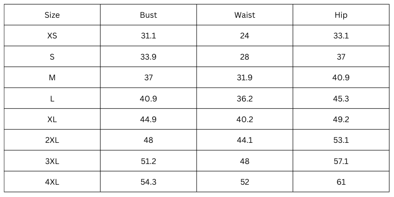 Size Chart (inches):