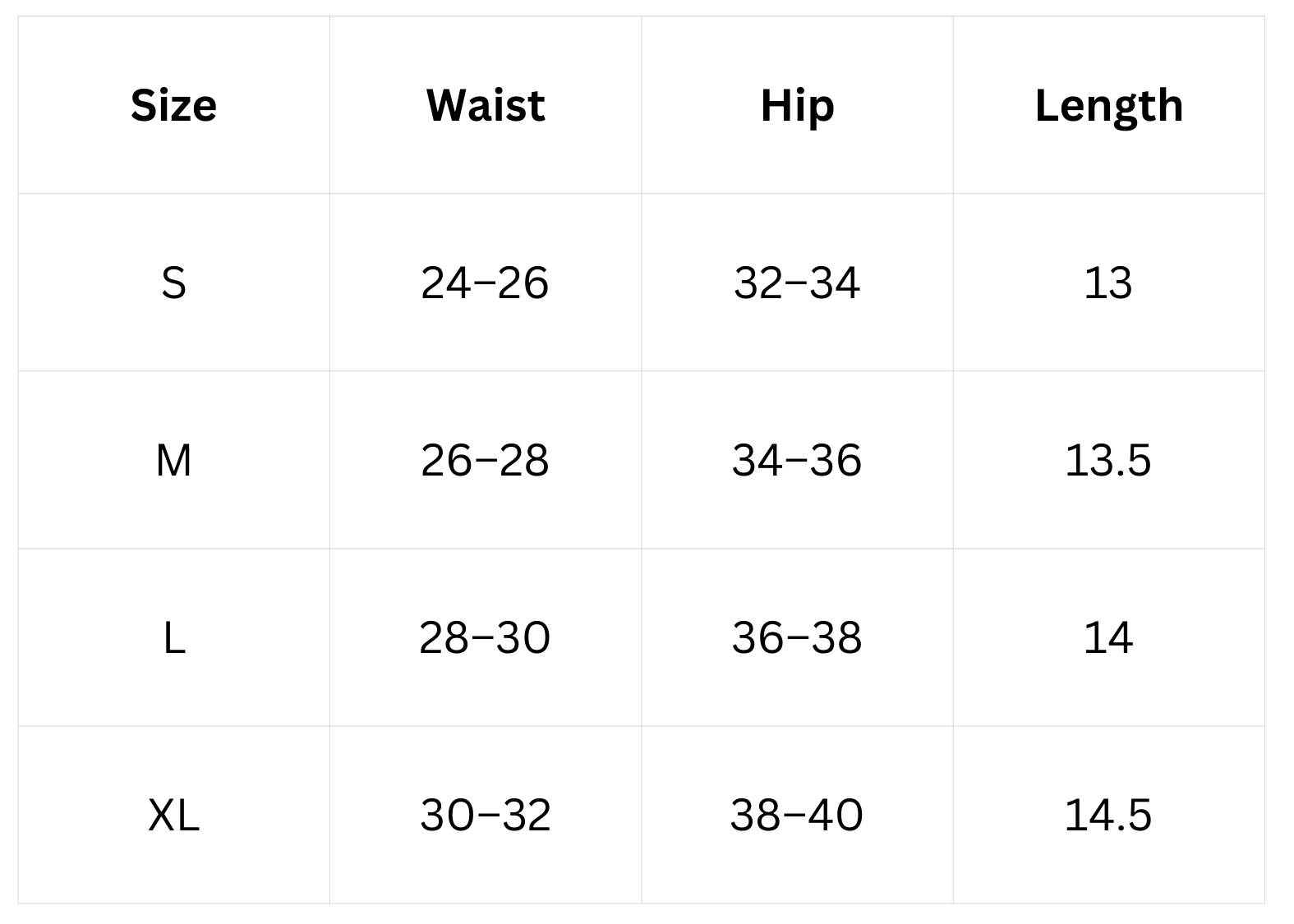 Size Chart (inches):