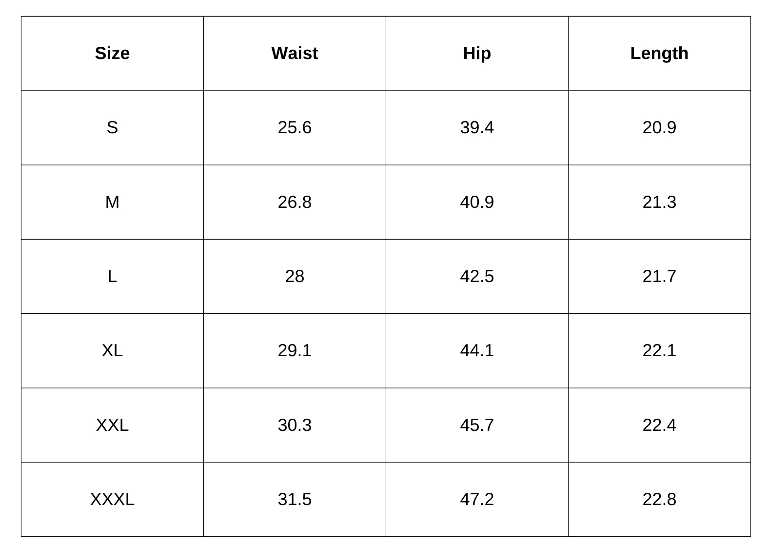 Size Chart (inches):