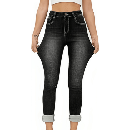Putting on these insulated jeans is a breeze, thanks to the zipper button closure that -effortlessly transforms them into leggings. The high-waist design not only adds a touch of sophistication but also keeps you extra warm.